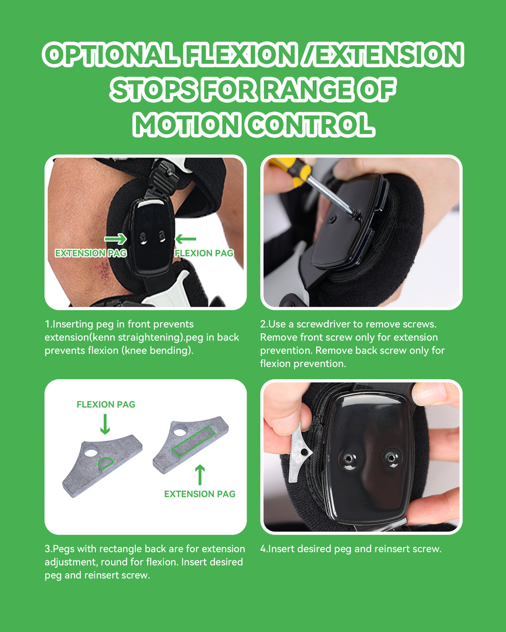 - COMPLETE CONTROL with the range of motion adjustable dial and extension and flexion sliders : The unloading knee brace comes with 13 adjustable dial knee extension and knee flexion sliders that limit and prevent the knee's hyperextension and flexion. This ROM knee brace ensures perfect recovery after post-op surgery bone-on-bone knee brace protection and most knee pain injuries. Complete control with the range of motion adjustable dial and extension and flexion sliders.